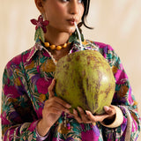 Swaya – A sun-kissed ode to summer, this vibrant co-ord set bursts with life in full bloom. Vivid fuchsia blossoms and lush emerald foliage sprawl across the fabric, creating a breezy, tropical allure where the florals take center stage in effortless harmony.