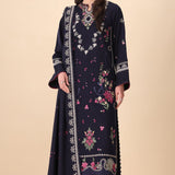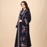 Luna - Indulge in the elegance of winter nights with this opulent midnight blue ensemble, beautifully embellished with intricate floral motifs in deep pink, magenta, and ivory. The rich, deep hues and exquisite embroidery exude timeless luxury, making it the perfect choice for an unforgettable winter dinner.