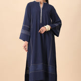Embrace the season in style with Nocturne, a chic, flowing long shirt in a rich midnight blue that radiates effortless elegance. Featuring functional pockets and delicate ivory thread detailing, this piece is elevated by an embroidered neckline that adds just the right amount of sophistication.