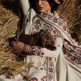 AABROO is a celestial-inspired winter treasure, wrapped in the soft glow of a creamy winter hue. Its intricate embroidery radiates a cozy warmth, with each stitch paying homage to timeless craftsmanship, weaving a story rich in heritage. Ethnic florals, delicately crafted in deep, sumptuous red and garnet, blossom across the ensemble, adding an enchanting layer of warmth and charm that feels both grounded in tradition and touched by stardust. Completing this ethereal winter look is a plush karandi shawl, elegantly bordered in contrasting tones that evoke opulence and magic, perfectly capturing the serene beauty of a winter's day.