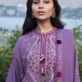 Gulrang is a soft, ethereal dream woven into fabric, where a delicate lilac hue dances with the light, casting a serene glow that captivates the senses. Ivory embroideries gently unfurl across a tranquil floral pattern, blending the softest shades of olive, lavender, and deep berry in a tender symphony that whispers of peace, grace, and timeless beauty. The swirling suzani embroidered festoon drapes the wearer like a soft caress, flowing with effortless elegance and enveloping them in its ultra-feminine charm. Each stitch is a work of art, crafting a story of delicate craftsmanship and eternal grace. Paired with a beautifully embroidered dupatta and tonal trousers, this ensemble is a perfect harmony of comfort, artistry, and refined femininity. Gulrang is not just an outfit, but a dreamlike experience, transporting the wearer to a world where soft beauty, grace, and femininity reign, leaving an enchanting aura that lingers like a soft, whispered promise.