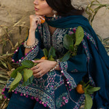 Introducing Zumar,an enchanting fusion of deep, opulent teal and the timeless artistry of tribal heritage, meticulously crafted for the winter season. This exquisite ensemble is fashioned from sumptuous khaddar, adorned with intricate ivory, berry, and moss embroidery that draws inspiration from the ancient motifs of tribal cultures. The bold geometric designs and delicately embroidered borders evoke a sense of rugged elegance, while the rich, wintery hues infuse the ensemble with warmth and depth. Paired with a luxurious karandi dupatta, Zumar effortlessly blends cultural richness with contemporary refinement, creating an ethereal, dreamlike allure. This masterpiece strikes the perfect balance between timeless tradition and the sophisticated elegance of the Zaha woman, enveloping the wearer in both comfort and unparalleled luxury for the colder months.