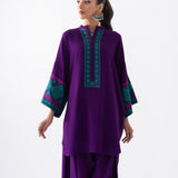 This stylish co-ord set features a vibrant purple base adorned with intricate teal cross-stitch embroidery, creating a bold yet sophisticated look. The top boasts a relaxed fit with elegant detailing around the neckline and sleeves, showcasing the contrasting teal embroidery for a pop of color. Paired with matching straight shalwar. The soft corduroy fabric provides a cozy feel, perfect for both casual outings and special occasions. This purple and teal ensemble is a unique statement piece for any wardrobe.