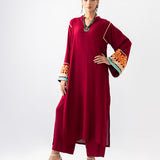 This stunning maroon co-ord set exudes elegance and charm with contrast ari embroidery in vibrant orange and turquoise on the sleeves, adding a pop of color and artistic flair. The top boasts a tailored fit with square sleeves style giving a comfortable yet chic silhouette, perfectly complemented by matching pants that create a harmonious, coordinated look. This ensemble ensures you stand out with grace and style.