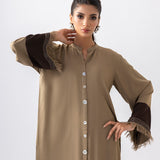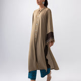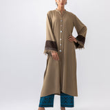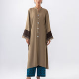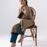 A stylish ensemble featuring a coffee-colored long shirt adorned with subtle yet striking contrast detailing in a rich chocolate hue. The shirt’s elegant design is paired with chocolate-colored pants, which are beautifully accented by intricate turquoise embroidery along the hem. This unique combination blends earthy tones with a pop of vibrant color, creating a perfect balance of sophistication and charm.
