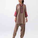An elegant coffee-colored short kurta set designed for modern simplicity and style. The kurta features contrast pink ari embroidery detailing on the sleeves and neckline, adding a pop of color and intricate charm. Paired with a straight-cut shalwar, this ensemble perfectly balances tradition and contemporary aesthetics.