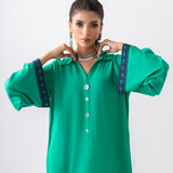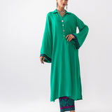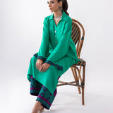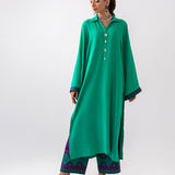 This chic ensemble features a vibrant turquoise corded top paired with contrasting purple-hued pants. The top showcases exquisite turquoise ari embroidery detailing on the sleeves, adding a touch of elegance and craftsmanship. The purple pants are adorned with matching turquoise ari embroidery along the hemline, seamlessly tying the look together. Perfect for blending comfort and sophisticated look