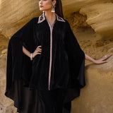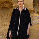 The black velvet cap is ideal for an evening edit, whether you're going to a cocktail party or a wedding. Lavish and feminine, it's detailed with a broad collar, short length, and heavenly embroidery on the collar and neckline.