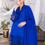 A long and opulent cobalt blue silhouette is layered with ethereal embroideries making an exquisite piece. Matched with a straight pants with trim specifying on the sleeve and a pretty finished dupatta, this silhouette is appropriate to make a marvelous look.