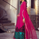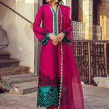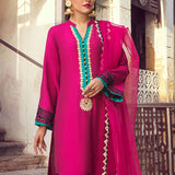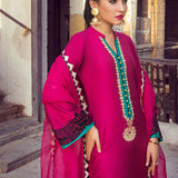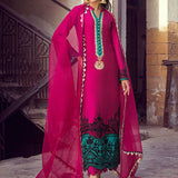 We are bringing you an elegant styled long shirt adorned with beautiful neckline and intricate embroidered border. It comes with fuschia pants and organza dupatta allured with kingri finishings all around the edges.