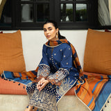 This elegant ensemble showcases a deep navy blue hue, providing a sophisticated backdrop for the intricate craftsmanship. The shirt is meticulously adorned with delicate white chikankari embroidery, creating a stunning contrast and showcasing the traditional artistry. Further enhancing the ensemble is the rich rust-orange dupatta, featuring a blend of traditional patterns and complementary borders, adding a touch of warmth and opulence.