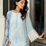 This exquisite soft light blue shirt adorned with intricate white chikankari embroidery. The delicate floral and traditional motifs are meticulously handcrafted, creating a mesmerizing play of light and shadow across the fabric. The neckline is further embellished with detailed embroidery, adding a touch of regal sophistication. A lightweight, flowing dupatta in a complementary pink shade drapes effortlessly, enhancing the ethereal charm of the ensemble. Coordinating blue trousers, tailored for a flattering silhouette, complete the look, making it perfect for both daytime elegance and evening soirees.