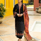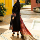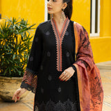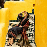 This midnight black shirt, exquisitely embellished with charcoal chikankari embroidery in contrasting rust and peach hues. The intricate detailing highlights the traditional craftsmanship, creating a visually captivating design. Accompanied by a lavishly marble patterned dupatta in shades of rust, orange and black. The fusion of classic black with bold, warm tones adds a contemporary twist to this timeless attire.