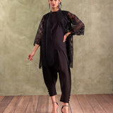 Crafted from ethereal black organza, the coat boasts intricate Chikankari, adding a touch of luxury to the overall look. Underneath, a Solid black Viscose Shirt provides a foundation of understated elegance, tailored to perfection for a flattering silhouette.
