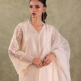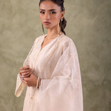 The centerpiece of this ensemble is the ivory Chiffon kameez, which exudes ethereal charm with its soft hue and intricate Chikankari embroidery. The embroidery at the sleeves and daman border adds a touch of opulence, enhancing the kameez's allure and lending it an air of regal sophistication.