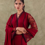 Dive into a world of opulent sophistication with our exquisite ensemble - a maroon Chiffon kameez adorned with intricate Chikankari embroidery, featuring lavish embellishments at the sleeves and daman border adds a touch of opulence, elevating the kameez's allure and exuding an aura of understated luxury.