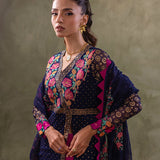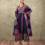 The Pure Chiffon kameez, in a regal shade of Navy Blue, features intricate block prints adorning its fabric, with contrasting embroidered sleeves enhancing its allure with a touch of traditional charm.