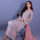 The centerpiece of this outfit is the pure chiffon long shirt, crafted to perfection with a flowing silhouette that exudes grace and femininity. With an embroidered neckline and meticulously designed daaman and sleeve border. Accompanying the shirt is a luxurious khadi net dupatta, delicately woven to drape effortlessly around you. Completing the ensemble are sleek viscose pants, tailored for both style and comfort.
