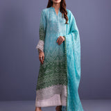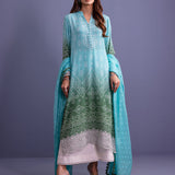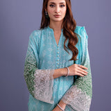 At the heart of this ensemble is a Pure Silk shirt, adorned with a mesmerizing digital print in refreshing mint and green hues. The sleeves and daman of the ensemble are adorned with a delicate embroidered border crafted from ethereal organza fabric. Complementing the shirt are Victoria raw silk pants, boasting a refined elegance with their GPO finishing. To complete the look, a dupatta made from mix khadi net fabric with GPO finishing adds a touch of lightness and grace.
