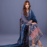 The deep midnight blue hue sets a mesmerizing backdrop for the delicate embroidery that adorns the shirt, tracing intricate patterns along the neckline, sleeves, and hem. Complementing the shirt is a matching Khadi net dupatta, exquisitely crafted with sheer fabric that drapes effortlessly over the shoulders. Paired with the shirt and dupatta are sleek Viscose pants, offering comfort and versatility without compromising on style.