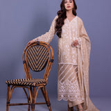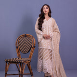 Step into sophistication with this beige ensemble featuring intricate front embroidery on the daaman (hem) and sleeves. The khadi net long shirt epitomizes elegance, draping gracefully to enhance your silhouette. Complemented by a matching khadi net dupatta, this ensemble exudes ethereal charm. Pair it with sleek viscose pants for a contemporary touch.