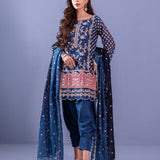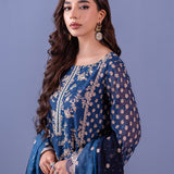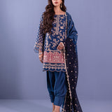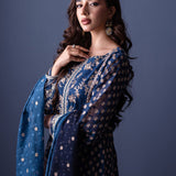 The short shirt, tailored from luxurious khadi net fabric, drapes effortlessly over the silhouette, enhancing the feminine form with its flattering cut. Intricate embroidery adorns the neckline, sleeves, and hem, adding a touch of opulence and intricate detail to the rich midnight blue hue. Accompanying the shirt is a matching Khadi net dupatta. Completing the ensemble is a Viscose shalwar, offering comfort and ease of movement without compromising on style.