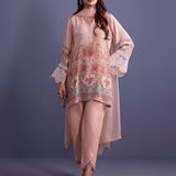 The centerpiece of this outfit is the short kameez made from Pure Silk, featuring a mesmerizing digital print in shades of pink. Adorning the sleeves is an intricate embroidered border crafted from ethereal organza fabric, adding a touch of sophistication to the ensemble. Complementing the kameez is a matching shalwar, ensuring a coordinated and chic look from top to bottom.