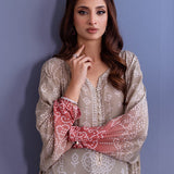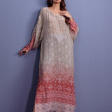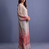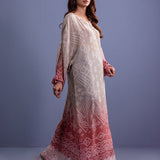The focal point of this ensemble is the Pure Silk kaftan, adorned with a captivating digital print in delicate shades of beige and coral. Adding to the allure of the ensemble is the embroidered border crafted from exquisite organza fabric, adorning the daman of the kaftan.