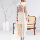 The beautiful ivory, flowy chiffon feels incredible to wear, light and elegant. This version features a chic, short shirt silhouette that feels modern and fresh, while still showcasing the exquisite delicate floral embroidery that blooms across the fabric and those lovely flared sleeves. Complete with its beautifully detailed dupatta and perfectly matched trousers.