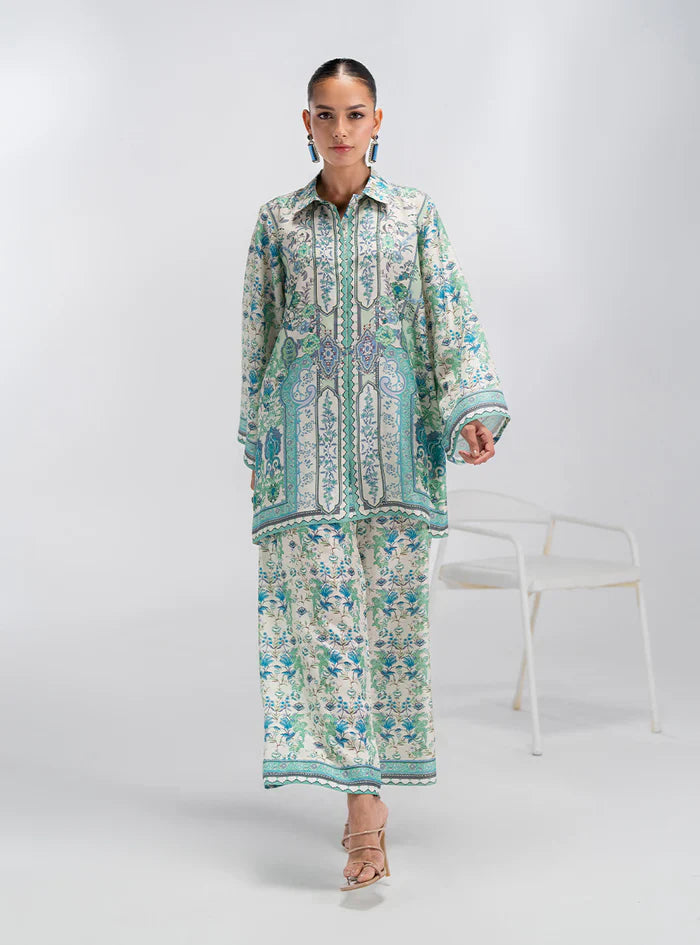 This stunning printed silk co-ord set that feels as good as it looks. Crafted from beautiful, flowy silk, the fabric drapes and moves with exquisite grace, while the captivating print in shades of blues, greens, and ivory creates a vibrant, artistic statement. The chic shirt features a comfortable silhouette, perfectly complemented by the matching printed trousers for a coordinated look that’s both stylish and easy to wear.