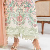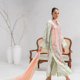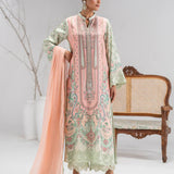 The delightful blend of blush pink and gentle mint creates a uniquely charming palette that feels both fresh and festive. The long shirt is adorned with a truly captivating design, featuring detailed patterns that draw the eye, while the graceful sleeves add to its elegance. Paired with a beautiful sheer peach dupatta.