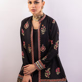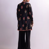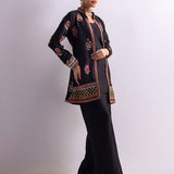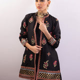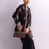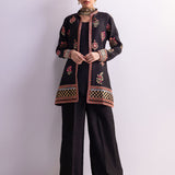 Choose this elegantly classy ensemble for upcoming festive gatherings. The embroidered jacket is complemented by a block print on jacket, perfectly matched with coordinating pants and a crop top