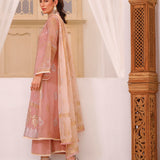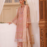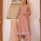 A minimalist tale is crafted from rose pink chiffon and decorated with gold and silver block print all over the front, adding effortless elegance to the outfit. Combined with tone on tone dupatta bordered with lace and matching pants adds more elegance to the outfit