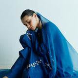 Our opulent blue shirt is hand embellished with white crystals and beads, paired with an applique dupatta and straight trousers.