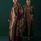 This elegant open kaftan features exquisite coffee-colored Kantha work, an intricate and traditional hand embroidery, adding a touch of artisanal charm. The deep green Kantha stitching on the sleeves and hem creates a beautiful contrast, Paired with matching pants and a coordinating inner, this outfit blends comfort with sophistication. The relaxed silhouette of the kaftan, combined with the vibrant yet earthy tones, makes it perfect for both casual and festive occasions, offering a modern twist on a timeless style.