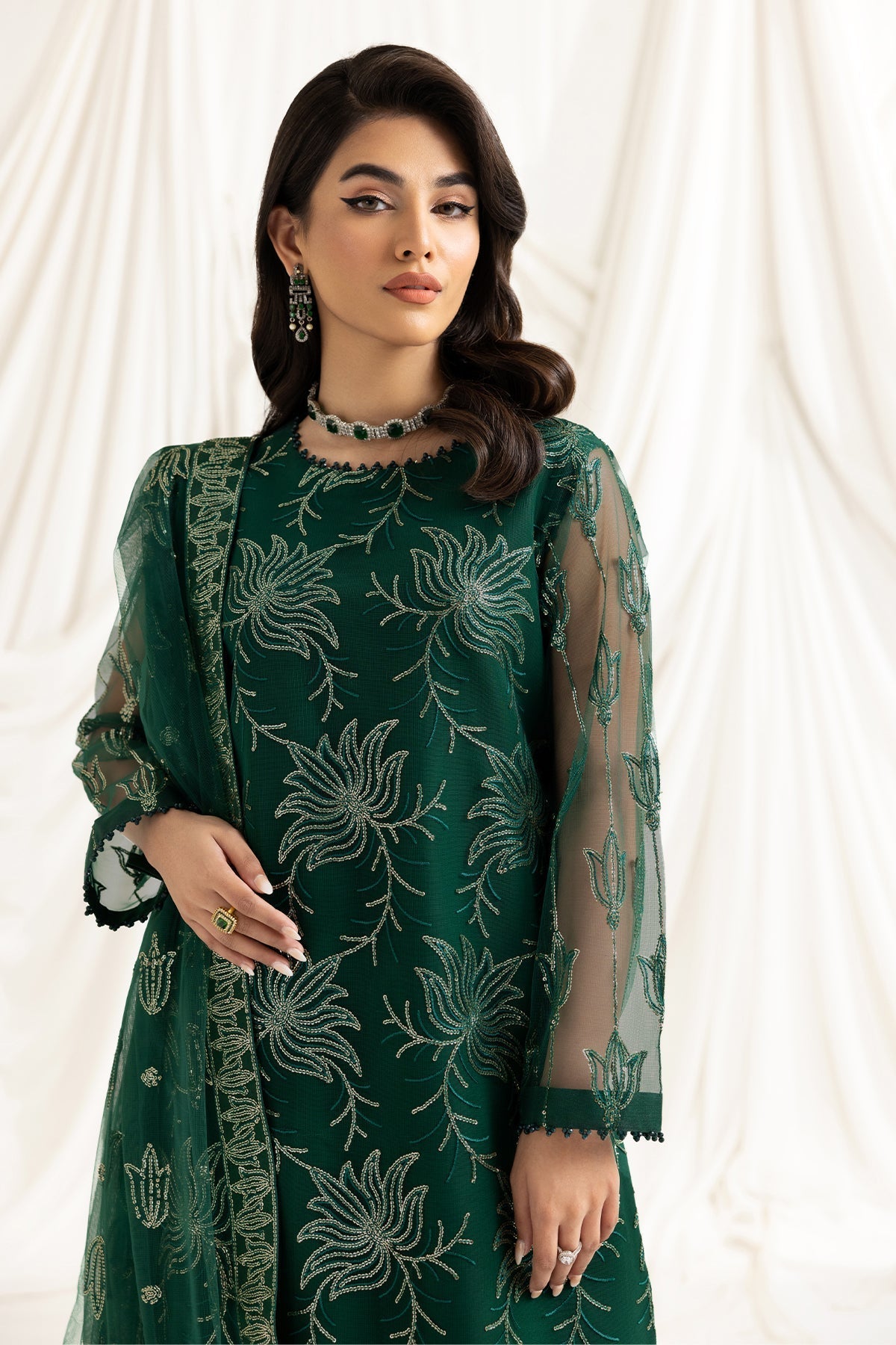 - Stitched includes Shirt, Lining, Dupatta and Trouser all embellished as shown in pictures.