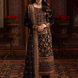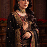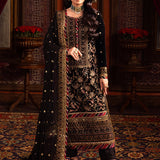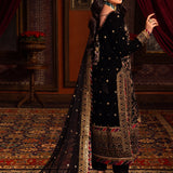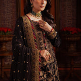 Indulge in timeless noir with this black number adorned with golden zariwork and a rich palette of maroon, rust, and moss green threadwork, adorned with 5mm & 3mm sequins. The velvet shirt featuring a majestic neckline and borders exudes splendor. Floral motifs on the front and back add a timeless touch. The dupatta with embroidered borders on velvet, completes this ensemble, making it a timeless manifestation of noir with velvet splendor.