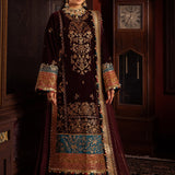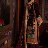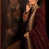 Enter a tapestry of gorgeous elegance with this deep plum outfit, adorned with sea green and rust applique inserts which are embellished with the stunning embroidery of antique gold zari and cupped sequins. The shirt is embroidered which creates a rich canvas showcasing the meticulous details of the design. The embroidered back, border for daaman, and sleeves border mirror the opulence of the neckline, weaving a seamless tapestry of gorgeous plum charm. The embroidered dupatta with its four-sided borders completes this ensemble, making it a true work of art and elegance.