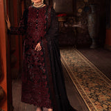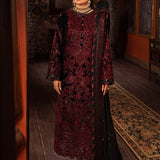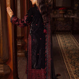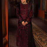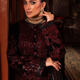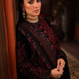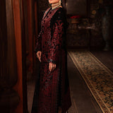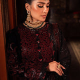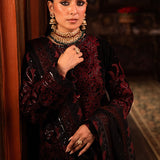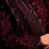 Step into a realm of onyx elegance with this number featuring a straight long velvet shirt adorned with maroon aari threadwork and cupped black sequins. The embroidered shirt is a canvas of intricate artistry, while the motifs add a touch of grace. The velvet back is embroidered with precision and adds depth to the ensemble. The daaman's cutwork and embroidered borders along with the sleeves showcases meticulous craftsmanship. The embroidered borders for chaak and neckline complete the outfit, culminating in a dupatta with four-sided borders. This outfit is a piece of onyx allure and maroon Aari magic.