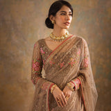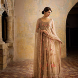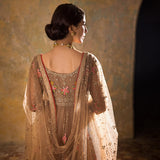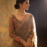 A floral fiesta on an earthy brown-toned fabric is featured in this toe-kissed festive wear. Hints of glistening gold and coral flowers adorn the bodice of the long gown. The look is finished off with a sheer similar-toned dupatta.
