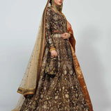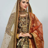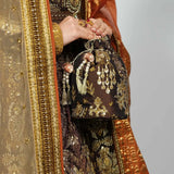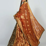 This exquisite antique taffeta lehenga set is a vision of traditional elegance, featuring a mesmerizing blend of multi gold color sequence and resham geometric embroidery that graces the entirety of the lehenga. The accompanying choli boasts a regal touch with a zardozi-work neckline and a graceful finish in rust silk. The ensemble is further adorned with an intricately embroidered pouch. The accompanying dupatta is a harmonious play of textures, with a skin-colored net adorned with booti jall and meticulously finished with embroidered borders on both tissue and velvet. To add a touch of opulence, the ensemble is paired with a jacquard-weaved rust dupatta, adorned with gold resham and sequence embroidered borders on sumptuous velvet. The overall effect is a celebration of tradition and craftsmanship, making this ensemble a radiant choice for special occasions.