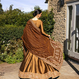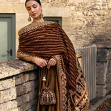 A true testament to opulence, Emera reimagines the iconic pishwas silhouette on a glimmering copper brown silk canvas. Accentuated with intricately adorned resham and tilla stitches, the pishwas flows delicately, making a bold statement. This set is paired with a silk churidaar and a lavishly embroidered velvet shawl that adds a layer of sophistication to the ensemble, elevating your presence at every occasion.
