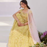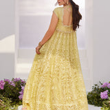 Beautifully crafted from a remarkably glamourous shade of kiwi organza, the Reine ensemble strikes the perfect balance between elegant and eye-catching. This flowing kalidaar is richly embroidered with intricate, silk threadwork, while the bodice is further uplifted with silver and pearl hand embellishment and little pops of pale pink blooms. The cascading panels flow gracefully bringing irresistible movement to the ensemble.
