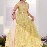 The kalidaar is paired with a delicate tulle dupatta in soft sea shell pink with embroidered borders to give the outfit a stunning flair.