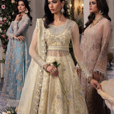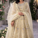 Indulge in the splendor of Solélia, a soft yellow marvel that exudes ethereal grace and unmatched luxury. Every detail radiates brilliance, from the gleaming silver and gold sequins to the lustrous pearls, mirror-like tinsels, and sparkling gemstones-a testament to impeccable craftsmanship. The intricately embroidered panels honor heritage artistry, with each stitch paying homage to timeless beauty. The dupatta, lavishly embellished with delicate floral motifs and fine embroidery, evokes the regal opulence of Eastern royalty. Solélia is the pinnacle of couture, a timeless masterpiece of elegance and sophistication.
