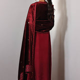 Nurgul, in a rich maroon hue like a deep crimson rose, reflects timeless beauty and fierce confidence. This ensemble features a heavily embellished neckline adorned with exquisite zardozi detailing, adding a luxurious touch, The elegantly crafted sleeves enhance the overall design. Paired with a bold winter berry velvet shawl, finished with finely detailed borders, and matching pants. Together, they radiate warmth and sophistication, inviting you to embrace the beauty of change.