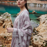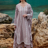 Hazel in Dull Mauve from our Lawnkari '25 Collection. A cutwork embroidered cotton lawn 3-piece outfit paired with dyed voile embroidered dupatta. €‹