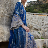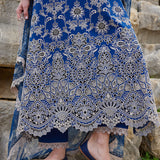 Qarba in Navy from our Lawnkari '25 Collection. A cutwork embroidered cotton lawn 3-piece outfit paired with digital printed chiffon dupatta.