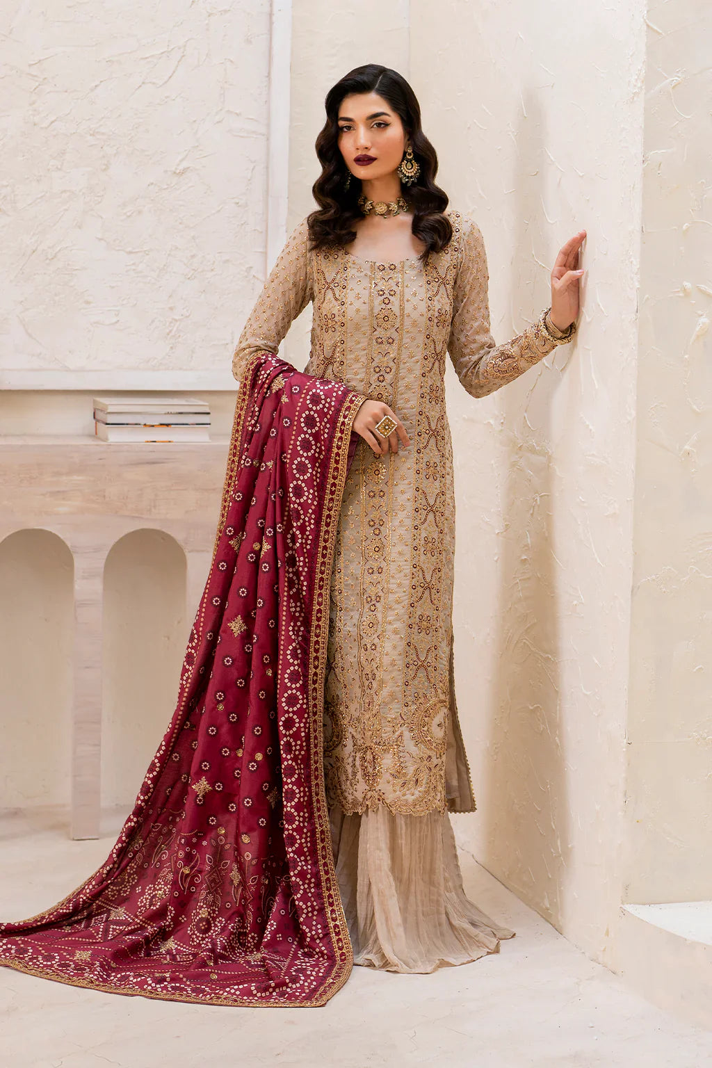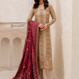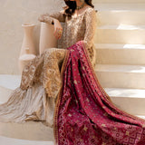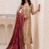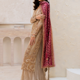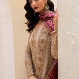 DISCRIPTION: Featuring a beautifully embroidered chiffon shirt front and back, complemented by a luxurious embroidered silk front daman patch. The sleeves showcase intricate details with a blend of embroidered chiffon, silk, and organza laces. The printed embroidered silk dupatta, adorned with silk lace on all four sides, adds a touch of refined glamour. Finished with a classic raw silk trouser, this outfit is perfect for