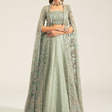 This captivating fresh ice blue ensemble features a shirt, embellished bustier, and lehenga. The shirt, crafted from aqua Kathan organza, is exquisitely hand-embellished with a dazzling mix of silver, lilac, and gold tones and boasts elegant, long drapey sleeves. It is paired with a stunning flared Jamavar lehenga, adorned with a graceful booti spray and heavy embellishments along the border, creating a look of opulent sophistication. This ensemble combines intricate detailing with rich textures, making it a perfect choice for any special occasion where you want to shine with elegance and style.